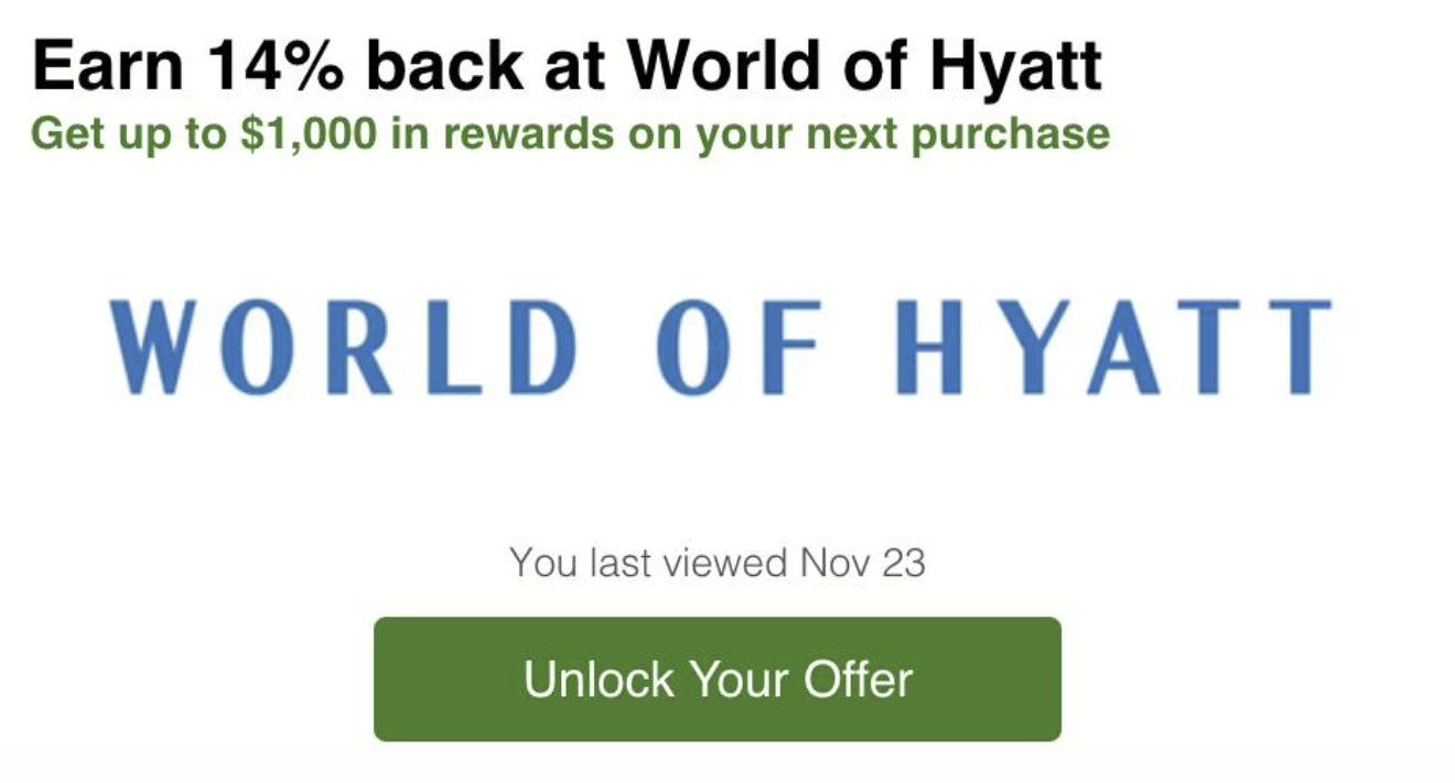 Could the work be turning, though? Hyatt is now appearing on Capital One Shopping at a consistent 2x back, and many of us have been getting targeted offers that are much, much better. We’ve seen several reports from our Frequent Miler Insiders Facebook group of targeted Capital One Shopping email offers for 10-15% back on Hyatt stays, and I received one for 14% back today, up to $1,000 in total rewards. All stays in North America are included.